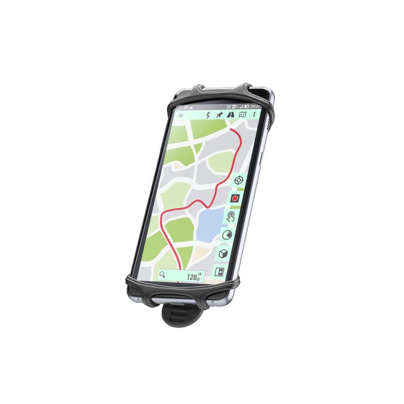 Supporto universale per bici realizzato in silicone resistente. Montaggio senza attrezzi sul manubrio. Adatto per smartphone da 4'' a 6''.