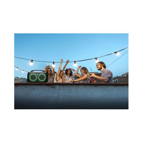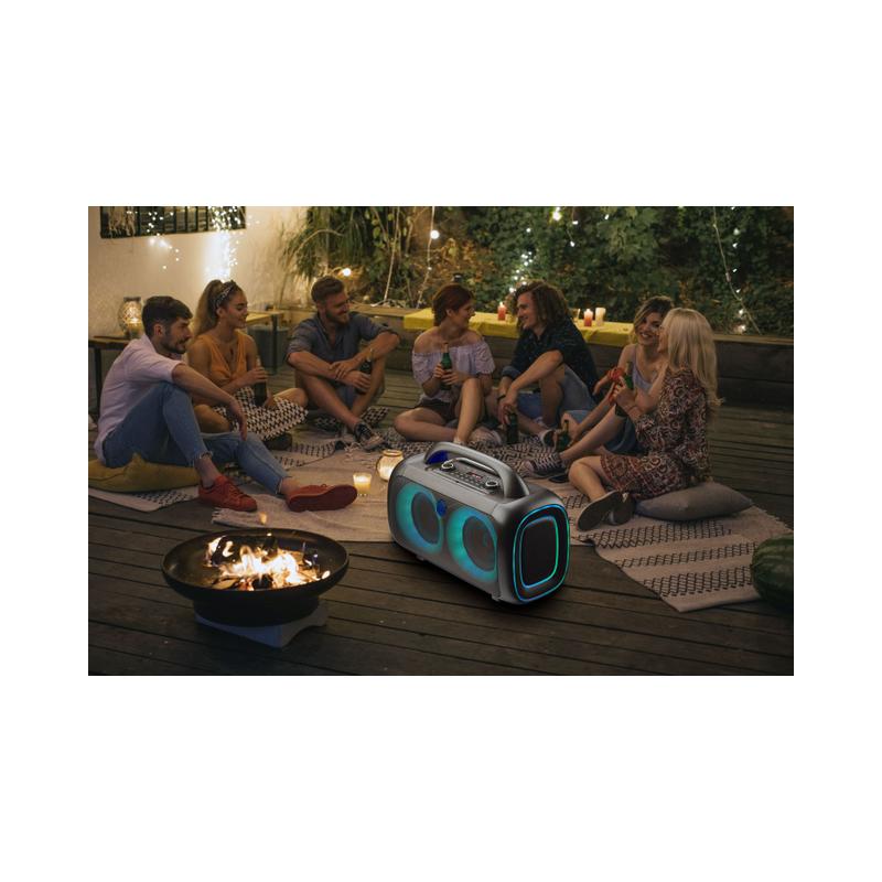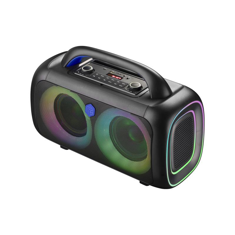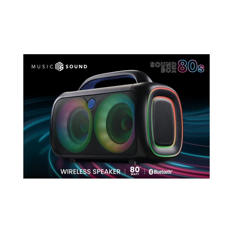 Accendi l’atmosfera con Music Sound 80s: lo speaker da 80W ideale per il tuo workout e per ogni party all’aperto. Le luci RGB si muovono a ritmo di musica per creare un'atmosfera unica, mentre la tecnologia True Wireless ti permette di collegare due speaker per un audio stereo ancora più potente. Grazie alla maniglia integrata lo porti ovunque, e con 4 ore di autonomia la tua musica non si ferma mai. Il controller intuitivo ti consente di gestire musica, effetti luce, impostazioni voce e molto altro con semplicità.