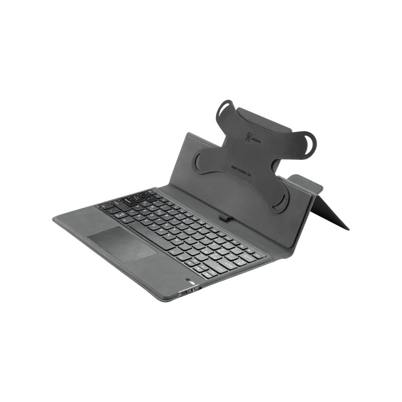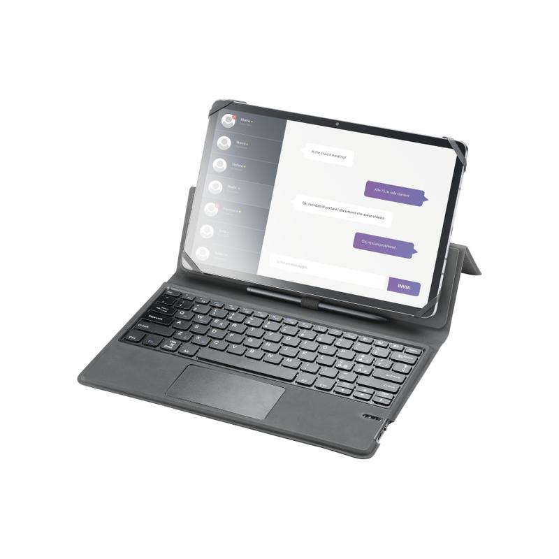KEYBOARD CASE è la custodia universale per tablet fino a 11’’ dotata di tastiera wireless integrata, touch ped e asola porta pennino. La tastiera permette un'esperienza di digitazione veloce e fluida.Il sistema di fissaggio interno in silicone abbraccia i quattro angoli del device adattandosi alle diverse dimensioni del dispositivo. Facilmente ripiegabile, diventa un pratico stand per scrivere, guardare film e navigare su internet.