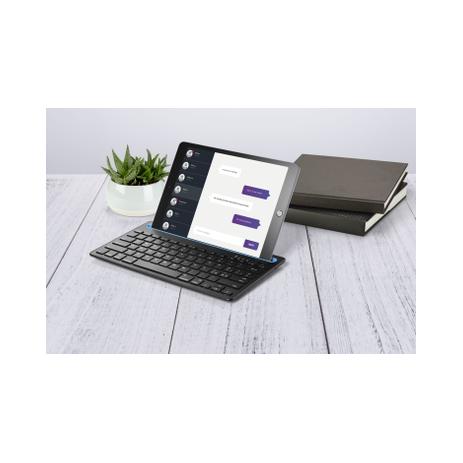 STAND KEYBOARD è la tastiera Bluetooth universale dotata di vano per supportare smartphone e tablet. Permette quindi di visualizzare lo schermo dei dispositivi connessi in tutta comodità, ideale sia a casa, sia in ufficio. Compatta e maneggevole è facile da trasportare e quindi indicata anche per l’uso in movimento. La batteria è integrata e ricaricabile, con un’autonomia in uso di 40 ore e in stand-by di 6 mesi. Il layout dei tasti è italiano (78 tasti QWERTY).