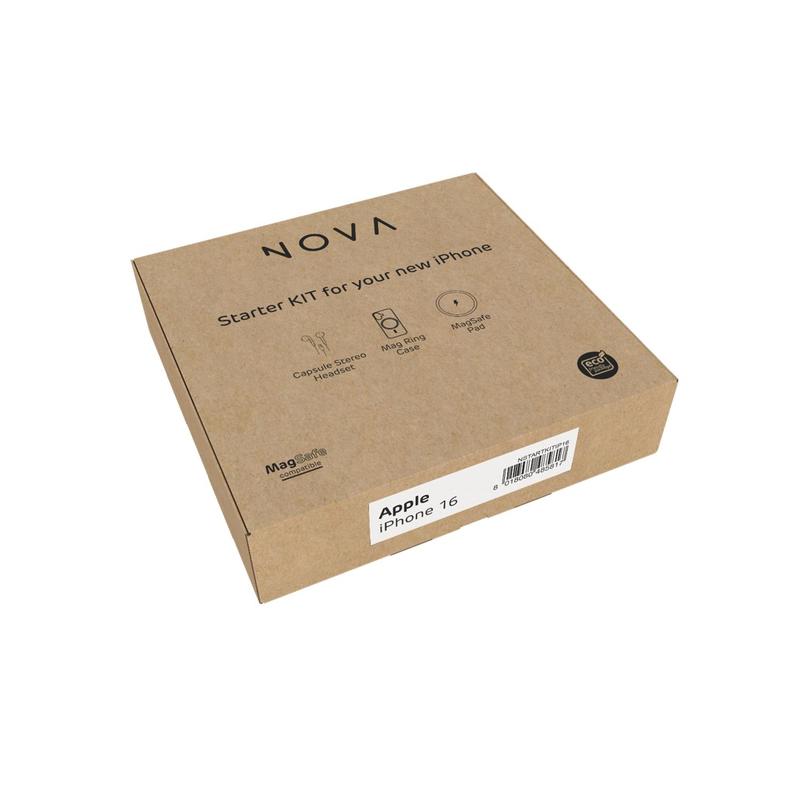Lo Starter Kit Lite offre un servizio completo all'utente finale includendo in un unico pacchetto: protezione, ricarica Magsafe e un auricolare USB-C. Inoltre, presenta uno slot per inserire la scatola del telefono accanto agli accessori.