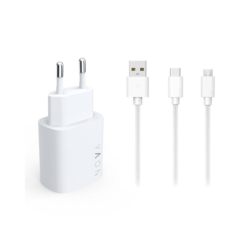 Nova - Caricabatteria da rete 18W con 2 cavi USB-A/USB-C e USB-A/Micro