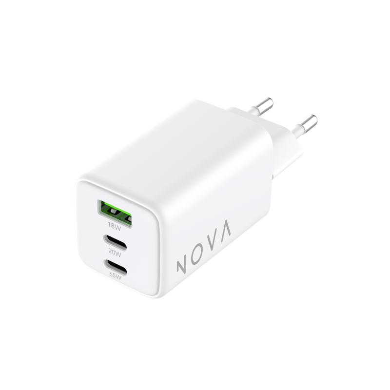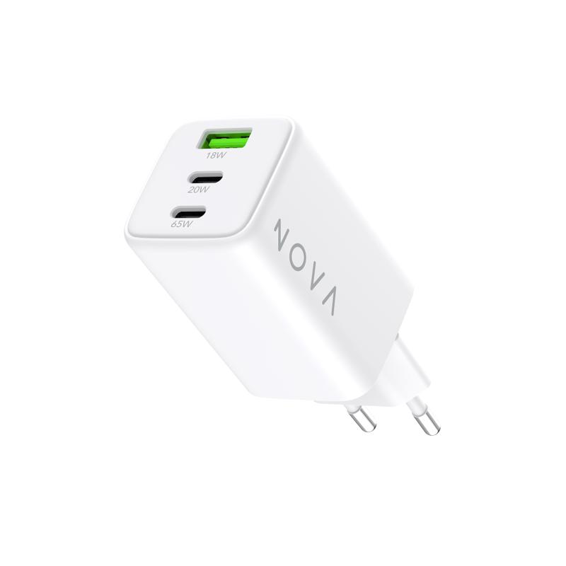Nova - Caricabatteria GaN da rete 2 porte USB-C PD 65W e 1 porta USB-A 18W - Bianco