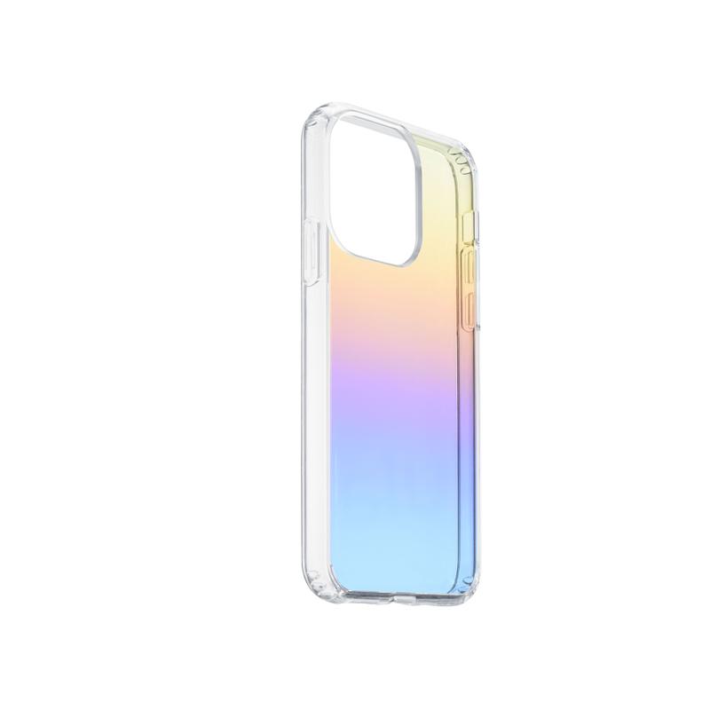 Prisma è la custodia semi-trasparente con effetto iridescente che cambia colore a seconda della luce. È realizzata in doppio materiale, retro rigido e bordi in gomma rialzati per attututire gli impatti e assicurare una maggiore protezione dello schermo.
