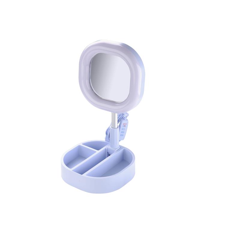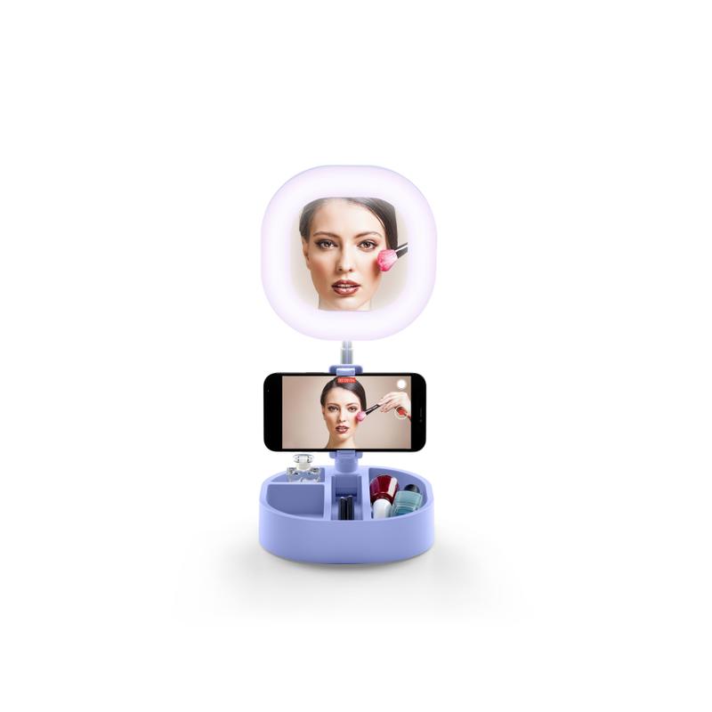 SELFIE RING MIRROR è l'anello led con specchio integrato e base portaoggetti. L’anello led da 6’’ ha tre modalità di illuminazione attivabili con telecomando ed è dotato di un supporto universale ruotabile per smartphone. Pieghevole e compatto, è facilmente trasportabile così ogni luogo diventa un set!